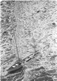 In 1978 I had agreed to skipper “Amazon” in the Bermuda Race and lined up a strong crew. However, as you can see from the next photograph, our plans were cut short. The photo was taken near Montauk Point where “Amazon” on her delivery to Newport turned a little too soon and unexpectedly found land. She was salvaged and continued her life. We did not sail the Bermuda Race. I sailed the race on George Coumantaros’ newer boat “Boomerang”