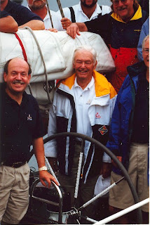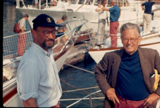 He is pictured with Alan Hanover, the present owner of “Columbia” the 1958 defender. Alan proudly announced in 2000 that he intended to restore “Columbia” to her original shape, adding approximately 4 feet to the stern . Olin responded quietly:”Why would anyone do such a thing?” After the restoration was complete, Olin conceded that the boat really did look better.I sailed with Olin on a number of boats and our lives crossed for other reasons as well as I lofted and built a number of his designs.